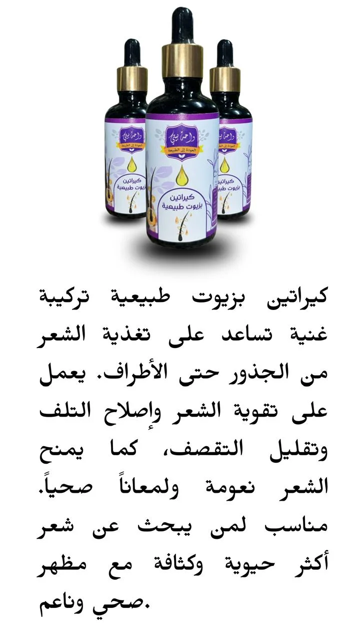 كيراتين بزيوت طبيعية هو تركيبة غنية مصممة للعناية الشاملة بالشعر، حيث يجمع بين قوة الكيراتين وفوائد الزيوت الطبيعية المغذية. يعمل على تقوية بنية الشعر من الجذور حتى الأطراف، ويساعد على إصلاح الشعر التالف والمتقصف الناتج عن العوامل اليومية مثل الحرارة والتصفيف المتكرر. كما يساهم في ترطيب الشعر بعمق ومنحه نعومة ولمعانًا صحيًا يدوم لفترة أطول. ومع الاستخدام المنتظم، يساعد هذا المنتج على تحسين مظهر الشعر وجعله أكثر حيوية وكثافة وسهولة في التصفيف، ليمنحك شعراً أكثر صحة وجمالاً بشكل طبيعي.